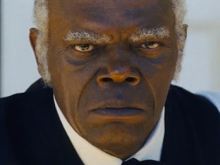 A másik karakter akitől kiráz a hideg a vénemberre maszkírozott Samuel L. Jackson, aki hiába fekete, szolgalelke és meggyőződése saját alsóbbrendűségében, a saját fajtáját kínozza.
