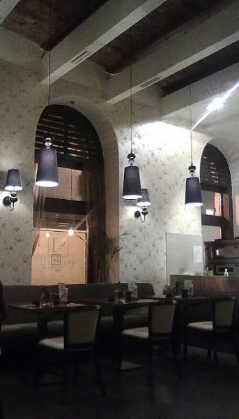 Csillagos ötös a belsőépítésznek, hogy eszébe jutott, hogy a végső ételkészítési fázis, a díszítés egy látványkonyhában történjen meg, ahol a “kollega” hímzett szakácskabátban vágja a friss rukkolát és mentát a kajámra. Imádom a virágos tapéta, a sötétre festett gerenda és a pucér tégla mennyezet találkozását. Mikor először megláttam majdnem megkönnyeztem, mert utoljára egy firenzei Coop-ban tisztelték meg a történelmi épület egy ilyen szép részletét. Hál istennek nem kell odáig menni, hogy ilyet lássunk!