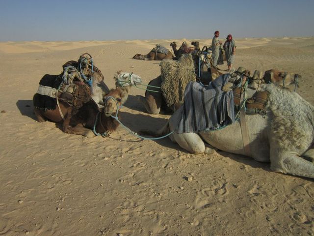 Ott is kaptunk tevegelő kaftánt, egy turbánszerű kendőt, amit azóta is sajnálok, hogy nem tanultam meg, hogy kössem úgy mint ők, mert nem folt melegünk. Egy fél órás túra volt, amit nagyon élveztünk. A nyugdíjasok lovashintóval jöttek ki oda ahova mi. Közben tuareg lovasok karistoltak a tevék között. Olyan picinek tűntek a lovak mellettünk, bár az arab telivér nem nagy növésű fajta. Csillogott a szőrük a napon, látszott, hogy jól tartották őket.