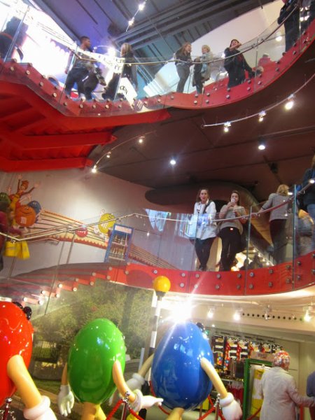 Hatalmas vasárnapi sor az étteremben és amikor nagy nehezen találtunk helyet, egy zenélő órajátékra nézett az üvegfal, ami mögött ültünk. De mögötte valami nagyon színes, villódzó dolog volt, ami úgy vonzott minket, parasztgyerekeket, hogy nem törődtünk a fáradsággal, tüstént meg akartuk nézni. Utólag tudtuk meg, hogy a világon 4 ilyen intézmény van, a kapitalizmus temploma számomra: M&M világ. Tényleg más világ volt, mert néztünk egymásra P.-vel, hogy mi ez az őrület? Hangos zene szólt, úgy beszéltünk hangosan egymás fülébe, mint egy buliban, táncoló alkalmazottak álltak a hengerekbe töltött minden színű drazsé előtt. De ijesztőbb volt, ahogy ez a tömeg pszihózis dolgozott, mert mindenki futva, kapkodva vásárolt, csak az övé legyen, dobálták a színes vackokat, játékot, pizsamát, bögrét a kosarukba, mintha nem készítene többet az a sok szegény gyerek valahol Ázsiában. Gondoltam, az én kedves kistestvérem biztosan örülne valaminek innen, de miután ezt végignéztem, úgy döntöttem, hogy nem támogatom ezt a vásárlásommal. Majd más.