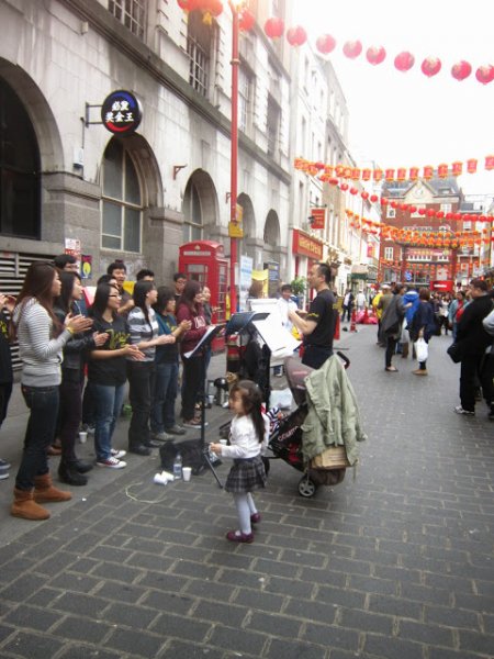 De most vörös lampionok felezték meg az utcát, magasan a járdák felett, pekingi kacsák piros bőrét mutogatták a kirakatok és ha kacsa, akkor legyen kövér, 3 méteres és felfújható. Emellett egy utcai kórus énekelt egy olyan zöldséges mellett, ahol egyetlen fura növényt sem tudtam volna megnevezni, sem magyarul, sem akármilyen nyelven. Ettünk egy süteményt, amit frissen készítettek az orrunk előtt és érdekes variációja volt a pudingos palacsintának és a képviselőfánknak.