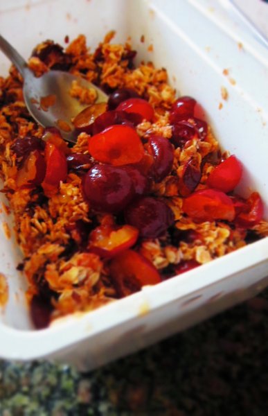 Egy kisebb adagot feláldoztam, hogy készül belőle szilvás müzli. Próbáltam rákeresni, hogy mi történik akkor, ha friss gyümölcsöt használok, de nem próbálkozott eddig vele senki, vagyis nincs nyoma, csak az aszalványosnak. Azt a gondolatot követtem, hogy ha összekeverem, a zab felszívja a gyümölcs levét, így a szárazanyag is ízesedik, utána megsütöm.